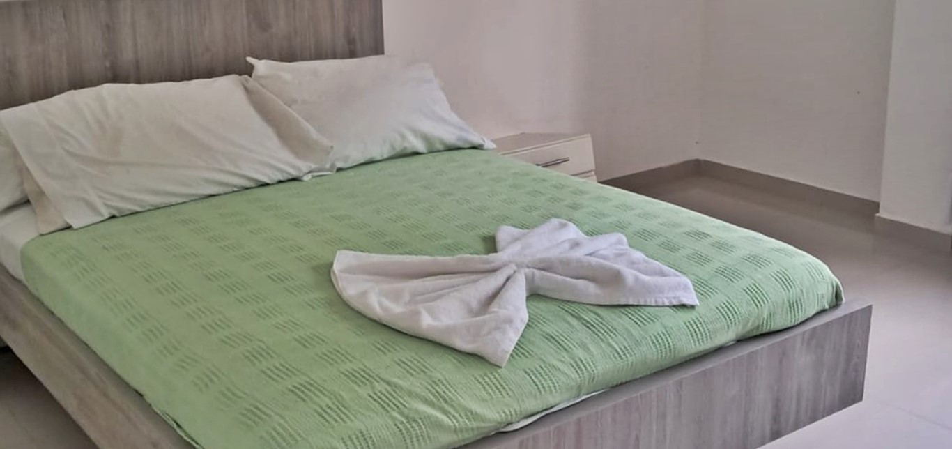 Cómoda y acogedora habitación, con cama doble, baño privado, neverita y TV Satelital.