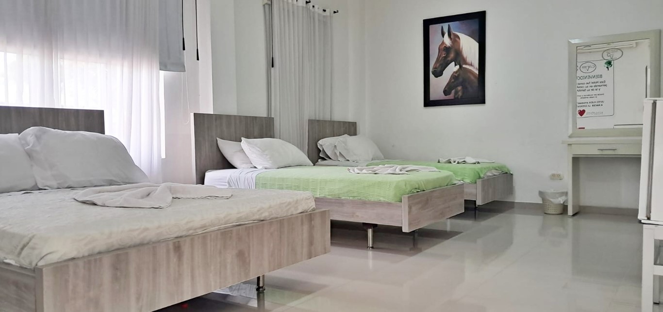 Espaciosa habitacióncon una cama doble y dos camas sencillas, baño privado, TV satelital y neverita.